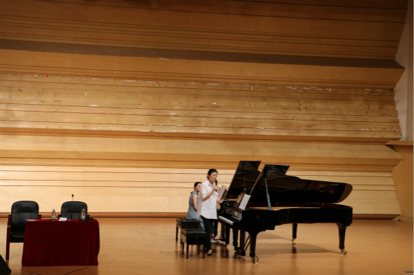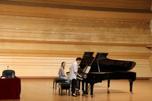在钢琴教学部主任胡健副教授的主持介绍下,朱晓蓓副教授在感谢肇庆学院音乐学院的邀请后开始了精彩的讲座。讲座分为讲授内容和提问环节两大部分。朱晓蓓老师将讲授内容分为了“四个困惑,六个解决方案”来逐一讲解,根据三位肇庆学院音乐学院学生的现场演奏,朱晓蓓副教授分别从巴赫作品的版本,装饰音,踏板,速度四方面来解除了同学们弹奏中遇到的困惑,随后,朱晓蓓副教授从“考虑弹奏指法;拇指在黑键上的演奏;唱中间声部;分手练习;触键离键;背谱演奏”六个方面耐心讲解了这些困惑的解决方案,并亲自演奏示范。在讲解的过程中朱晓蓓教授表示:巴赫作品的版本争议、讲座争议都非常大,没人可以说自己是权威,但是我要跟大家分享的,就是我在练琴中,在教学中或者同行们可能会遇到的一些情况的解决,所以希望能够得到积极的提问和交流。在讲座最后的提问环节中现场气氛十分积极热烈,同学们都积极发言,我院陈国庆副教授也参与了其中。